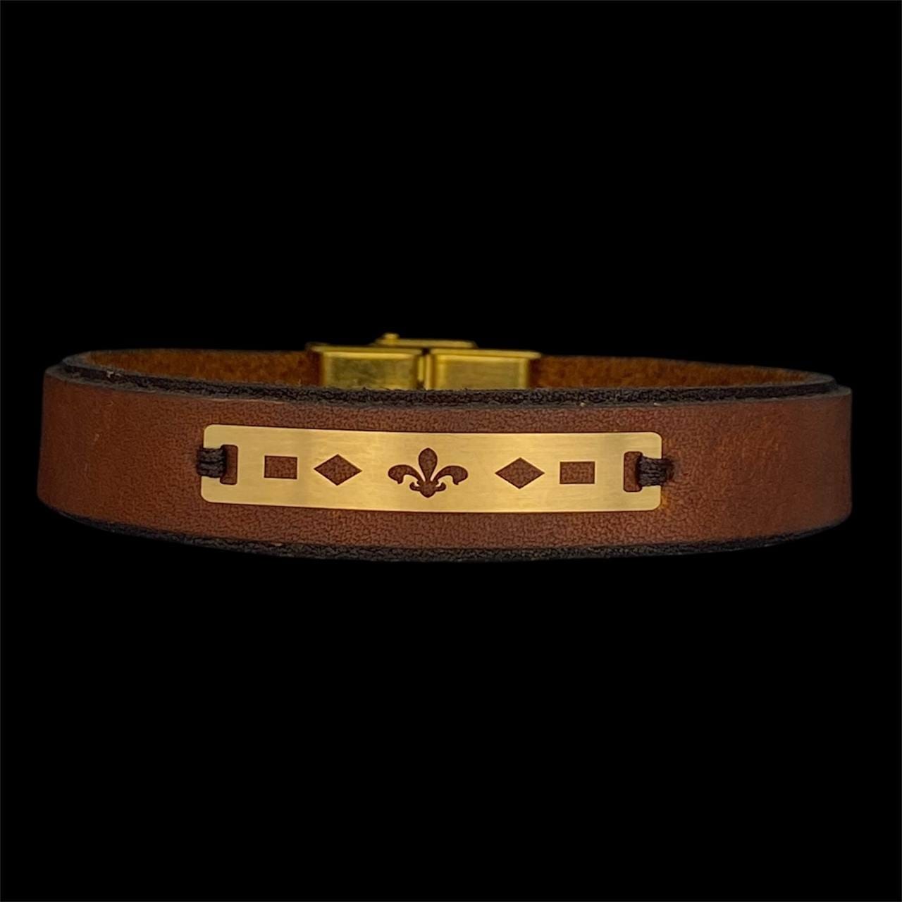 دستبند چرم و طلا 18 عیار مردانه طرح پلاک: هندسی