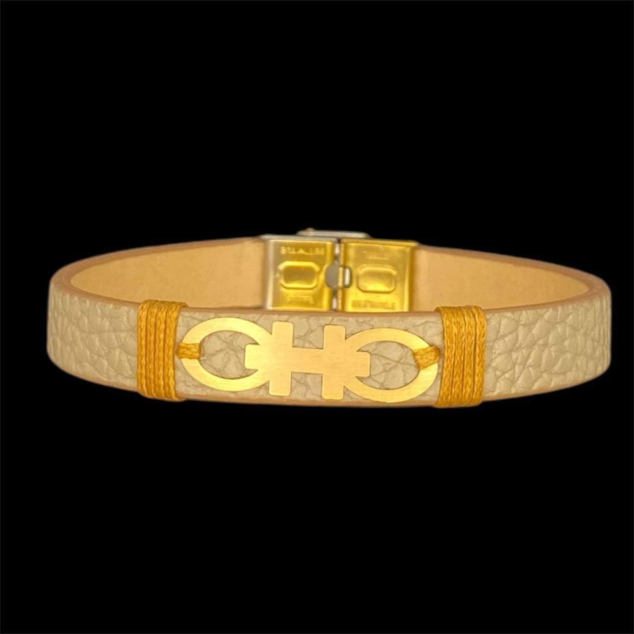 دستبند چرم و طلا 18 عیار مردانه طرح پلاک: هندسی