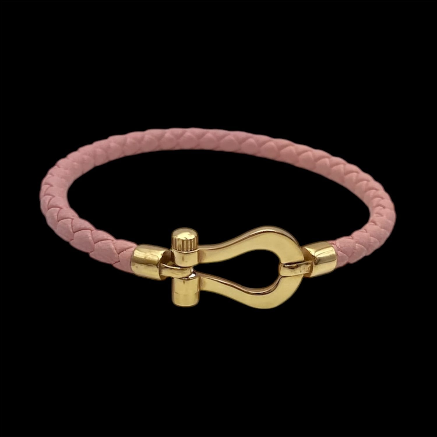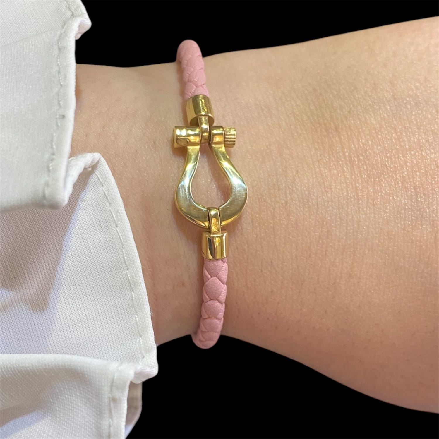 دستبند طلا 18 عیار امگا با بند چرم صورتی